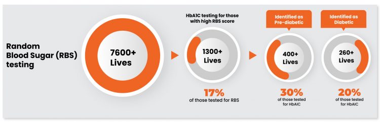The results from our screenings further emphasize the urgency of our purpose. Alarmingly, from those who were further recommended for the HbA1c testing, 30% of those screened were found to be at the pre-diabetic stage and 20% in the diabetes stage, underscoring the widespread nature of the issue and the critical need for proactive intervention. We also found that many participants were diagnosed with diabetes for the first time; hence, the testing enabled them to take early action. In the most urgent cases, individuals who were previously unaware of their condition were promptly referred to hospitals for further care.