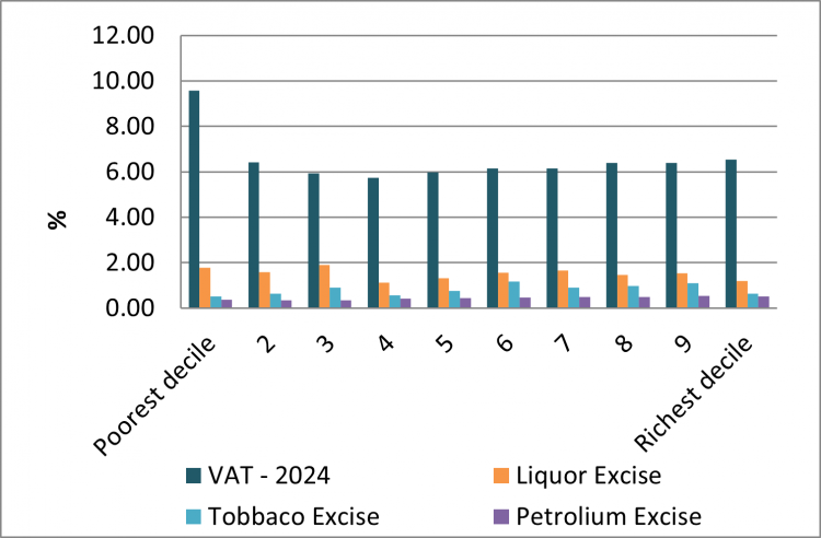 VAT applies to a wide range of goods and services, affecting all consumers. However, its impact is regressive, taking a larger proportion of income from poorer households compared to richer ones (Figure 2). In contrast, excise taxes on products like alcohol and tobacco are less burdensome on lower-income groups. The top 20% of households contribute 43% of alcohol taxes and 44% of tobacco taxes, while the bottom 40% of households account for 19% of alcohol taxes and 14% of tobacco taxes. Additionally, VAT applies to basic commodities that everyone needs, whereas excise taxes apply to tobacco and alcohol, which are harmful products that contribute to non-communicable diseases (NCDs). In this sense, higher taxes on tobacco and alcohol act like an upfront investment in public health, helping to offset future healthcare costs.