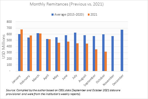 At a time when the external sector is confronted with daunting challenges such as depleting foreign exchange reserves and a stumbling dollar-rupee exchange rate, there has recently been a sharp drop in remittances, making the efforts to get on top of the country's forex crunch an uphill battle. As of October 2021, Sri Lanka's remittances receipts has dropped 14% compared with the respective period of 2020. This divergence has become increasingly acute in recent months, with inward remittances in September and October 2021 falling sharply to USD 353 and 317 million, respectively, the lowest levels for both months since 2010 and 2009. (Data sources: CBSL historical data and the provisional figures mentioned in the institution's weekly reports; the November and December 2021 figures were not known at the time of writing this article)