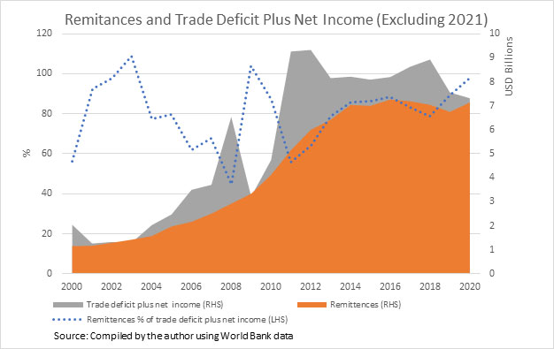 The figure also shows (X-M) plus NI and remittances as a percentage of (X-M) plus NI as separate series over the past two decades. One of the notable facts is that with the improved remittances flow, the widening trade deficit plus negative net income has been steadily supported by around 80% since 2014. Therefore, the recent remittances drop is a massive blow for the island nation, primarily in balancing its higher imports over exports (financing the deficit in the trade account).