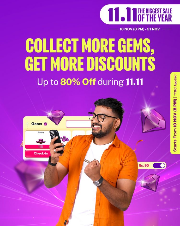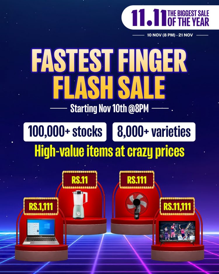 The Fastest Finger Flash Sale kicks off at 8.00 p.m. on 10 November, with over 100,000 stocks and more than 8,000 varieties available. High-value products will appear at special price points such as Rs. 11, Rs. 111, Rs. 1,111, and Rs. 11,111. Shortlist your favourite items beforehand and add them to cart. When the flash sale starts, you only need a few taps to check out before stocks run out.